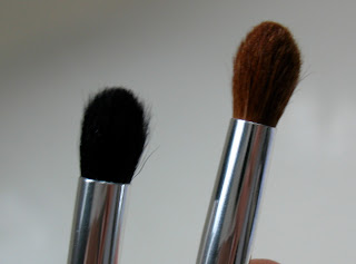 Sonia Kashuk Large Crease Brush (left) and Studio Tools Crease Brush (right); you can't tell very well here, since they'd both been washed and were therefore fluffier than usual, but the Sonia Kashuk brush is much denser than the Studio Tools